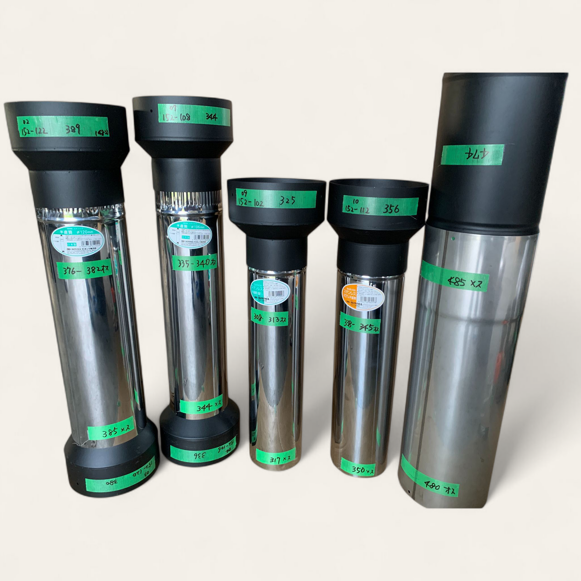ホンマ製作所のハゼ折り煙突は150ミリ、120ミリ、110ミリ、106ミリ、100ミリとなっておりそれぞれに対応したアダプターを用意しております。