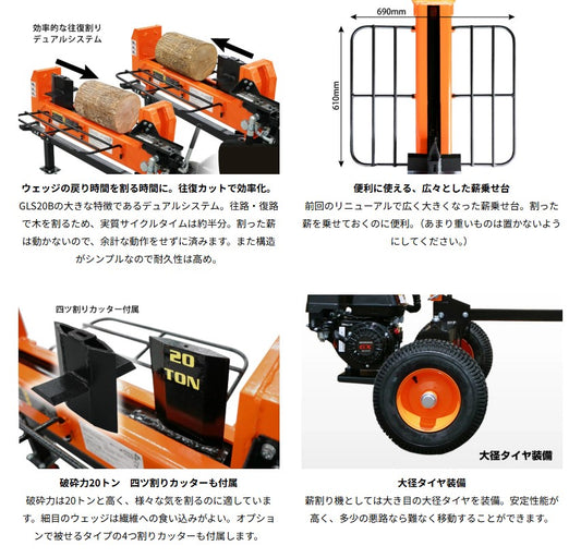 搭載するエンジンはホンダ製GX200。独自開発のシリンダーとコントロールバルブに、高耐久モノコックフレームが安定した薪づくりを実現します。舟形クローラーで林道・獣道などの悪路を自在に走行、あらゆる場所で薪割りを可能にします。始動確認済み、オイル充填済みなので商品到着後にガソリンをいれるとすぐにお使いいただけます。