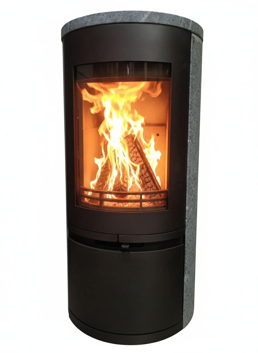 内部にスチール製燃焼室、外装に天然ソープストーン(滑石)を組み合わせた、円筒型・蓄熱タイプの薪ストーブです。